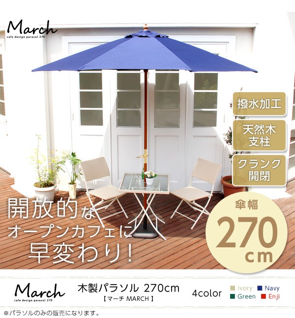 【商品名】 木製 パラソル/日よけ 【グリーン】 幅270cm 撥水加工 簡単設置 工具不要 『マーチ MARCH』 〔ガーデン テラス 庭〕 【ジャンル・特徴】 マーチ MARCH 天然木製 モダン 北欧風 パラソル 日よけ 日除け 傘 かさ カサ ガーデン テラス 庭 ベランダ ウッドデッキ オープンカフェ バーベキュー アウトドア BBQ キャンプ 休日 家族 ファミリー ガーデニング 園芸 家庭菜園 ぱらそる ひよけ プレゼント 贈り物 お祝い